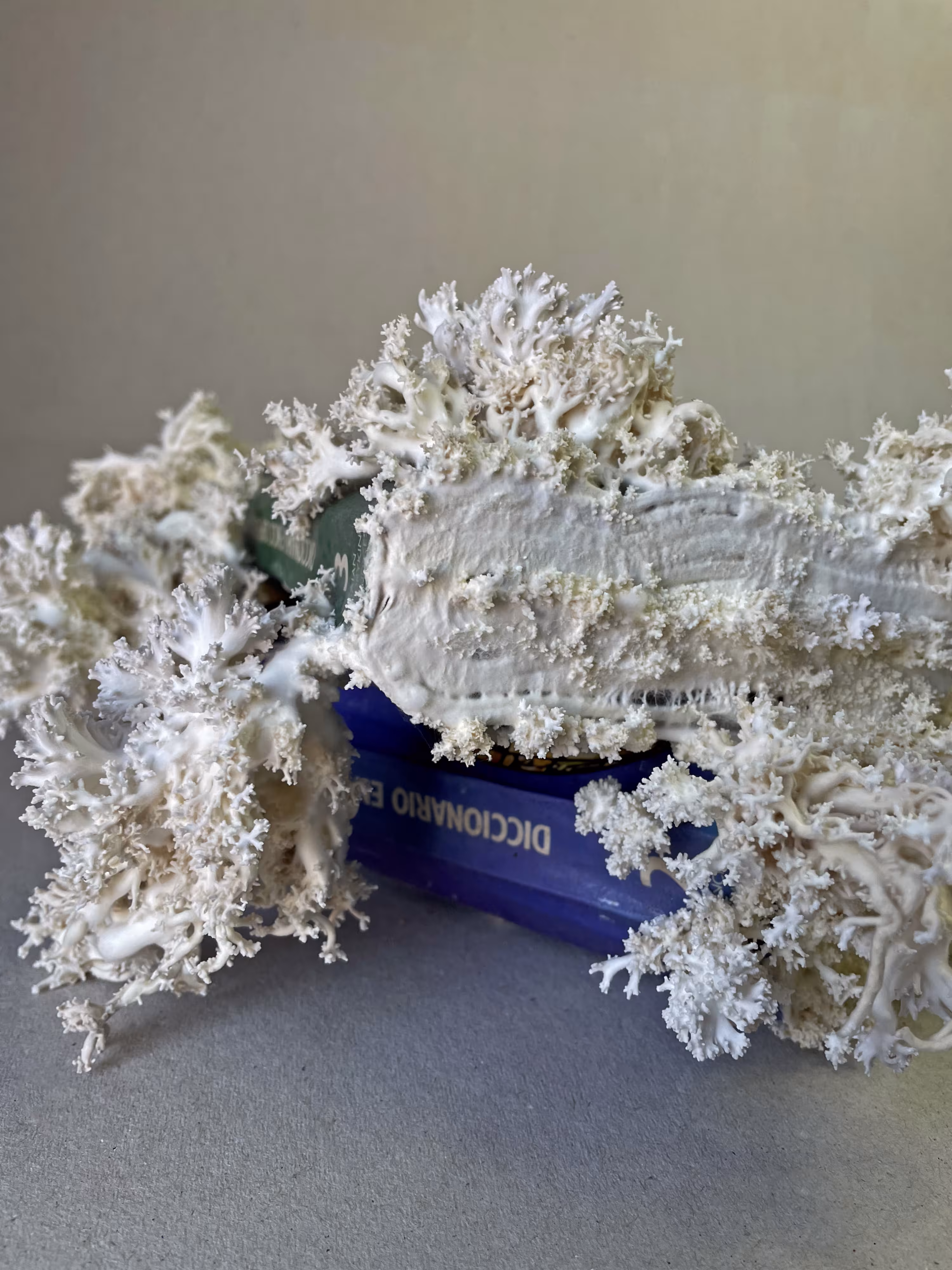 Primero fueron los dos grabados, que plantean la imagen de unas bibliotecas destruidas como un escenario distópico, sin explicar las causas, invitando a preguntarse qué ha ocurrido para que esas catedrales del saber hayan llegado a ese estado y qué le ha pasado a la sociedad que creía en esos archivos. Todas esas ruinas. Después fue el texto, ese cuento que ensaya sobre otras formas de almacenar la información, de viralidad, de memoria. Finalmente llegaron esos libros con hongos, esa simbiosis entre dos formas de conocimiento. Tres fases, en tres lenguajes, de una misma exploración de escenarios posthumanos.